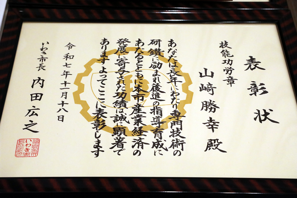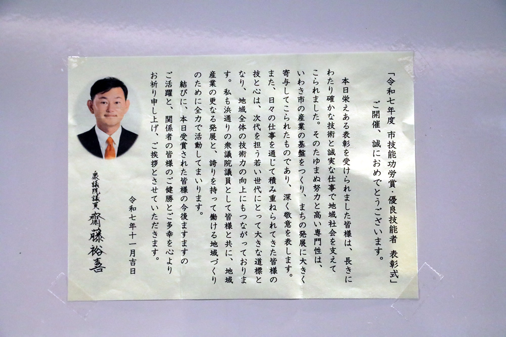 いわき市技能功労賞を頂きました。 2025年11月18日、いわき市ラトブにて、いわき市技能功労者・優秀技能者表彰式が行われました。 有限会社 正工務店社長の山崎は、おかげさまで技能功労章を頂くことが出来ました。ありがとうございます。表彰式の模様です。 内田市長の祝辞です。 これからも、地域に根差す工務店として、日々精進してまいります。